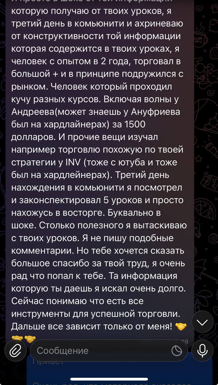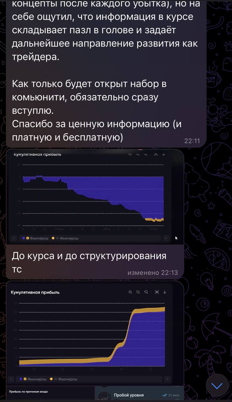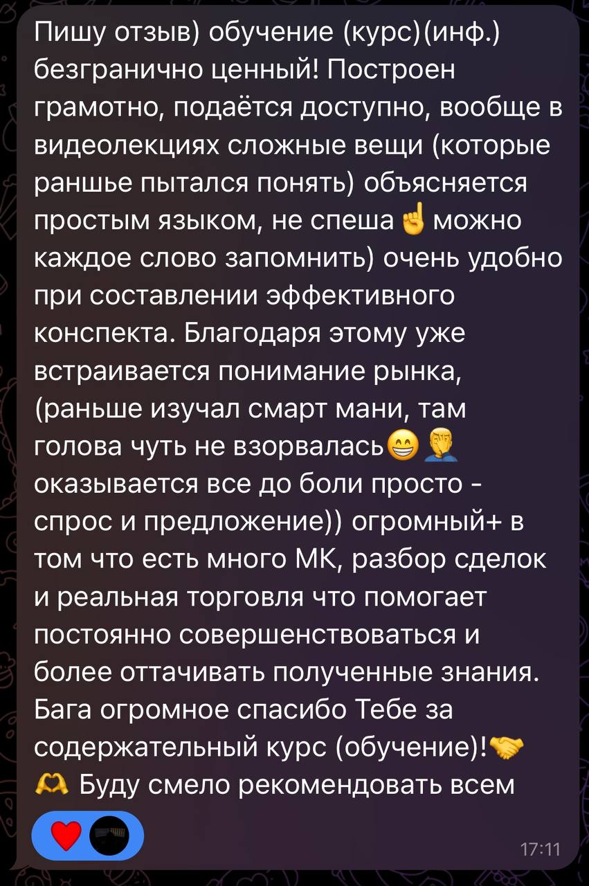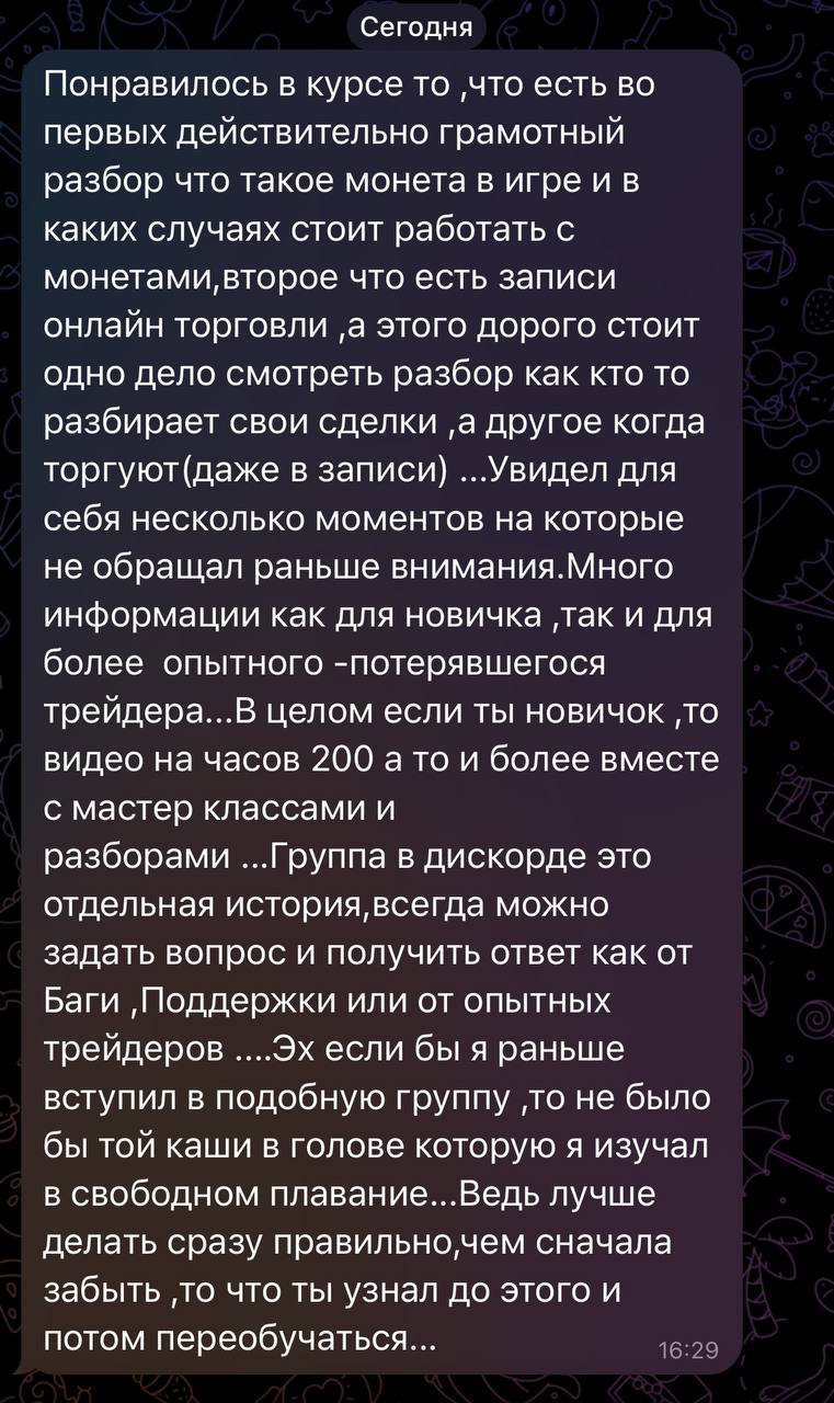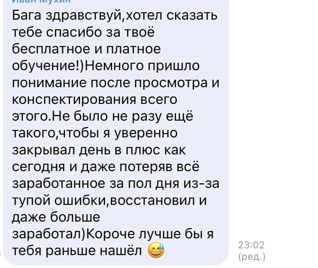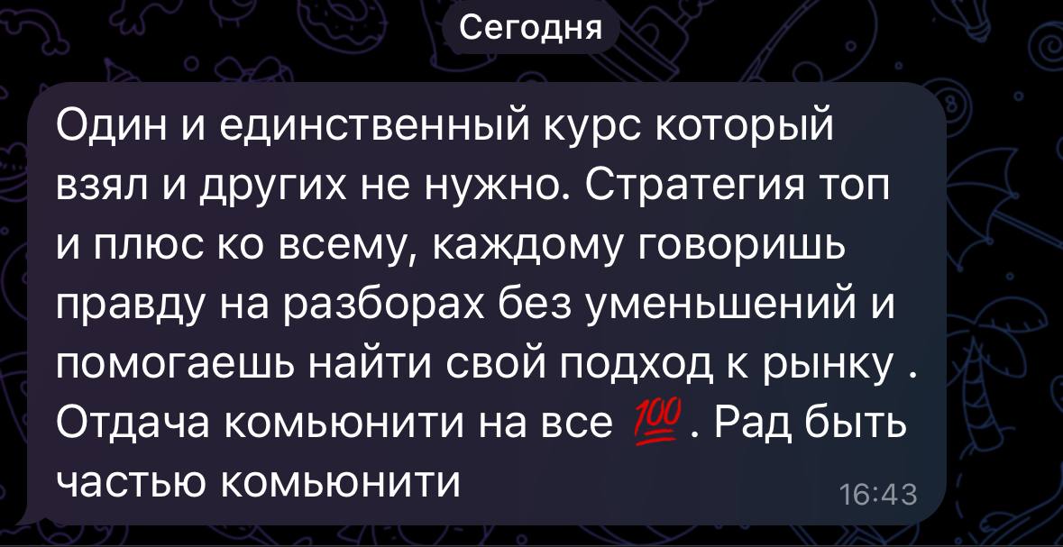 Я лично провожу совместную торговлю, мастер-классы и разборы ваших сделок — без кураторов, помощников и посредников. Если приглашаю коллег — только профессиональных трейдеров из цеха. Обучение можно начать в любой момент, доступ к материалам бессрочный.