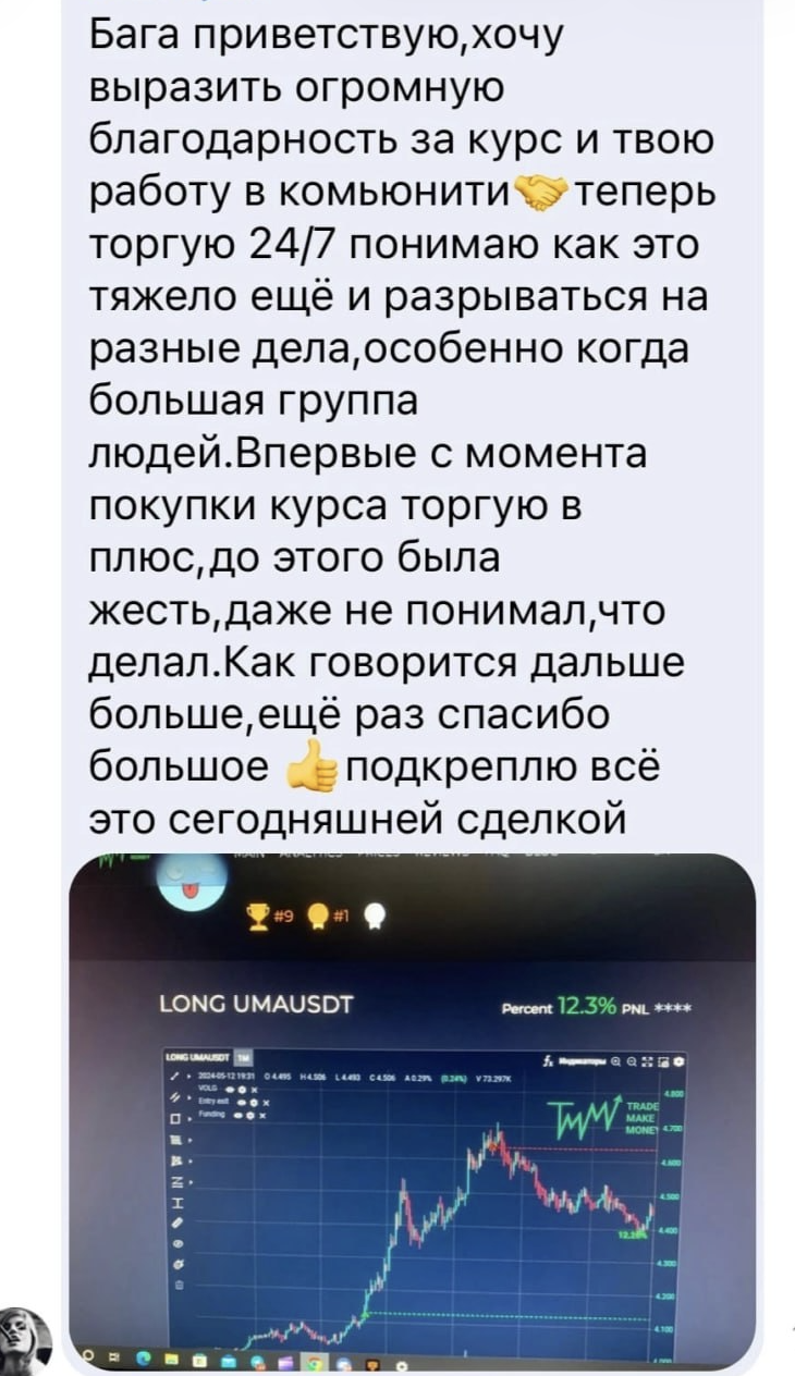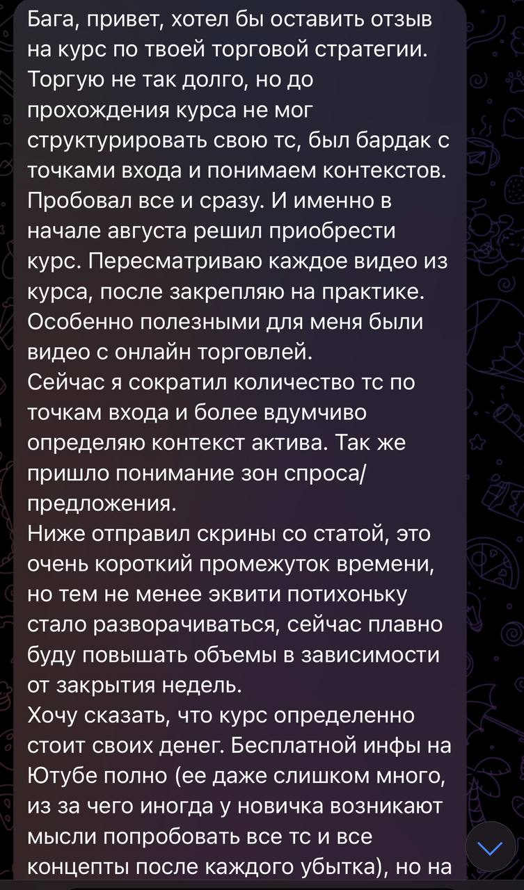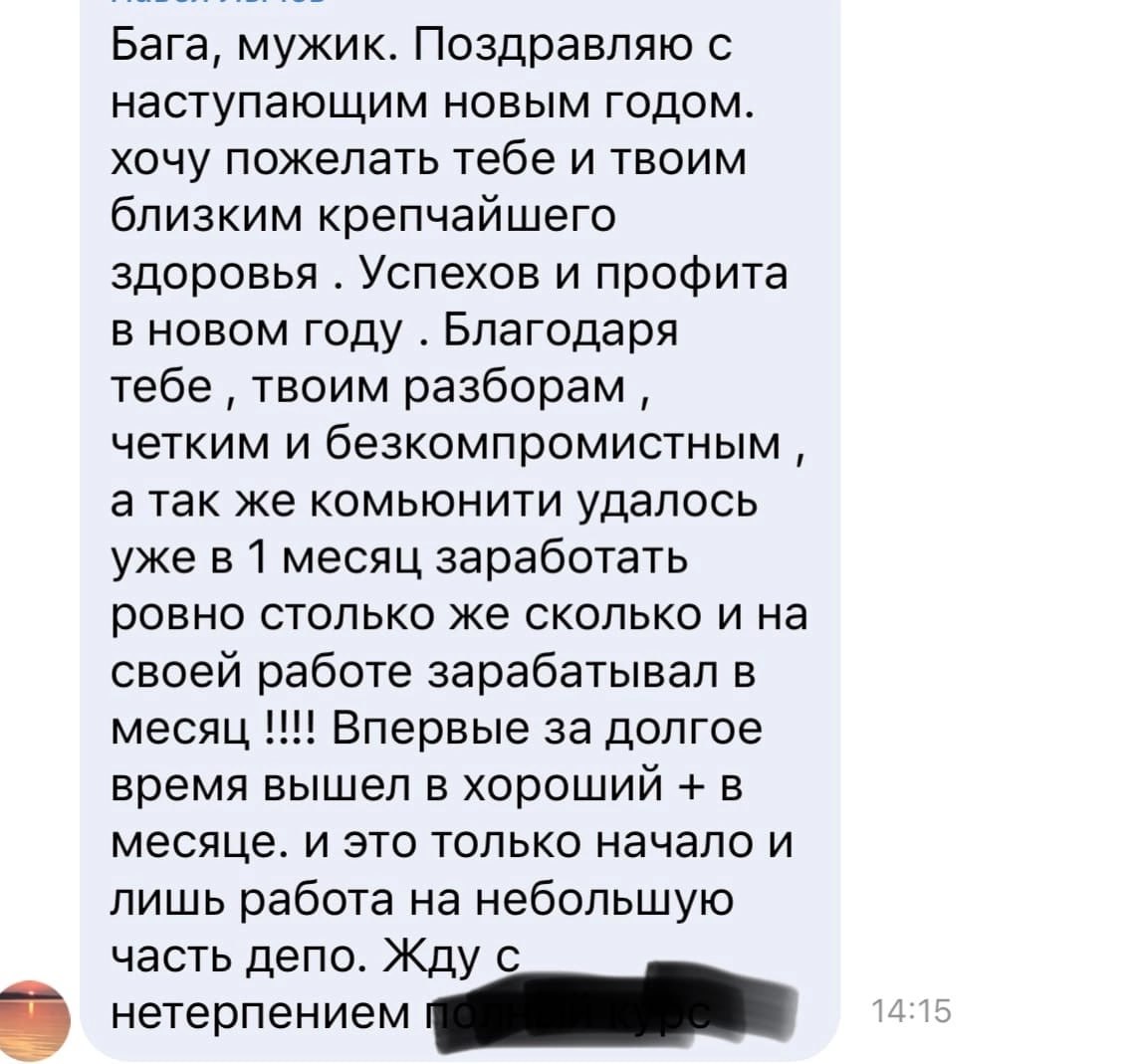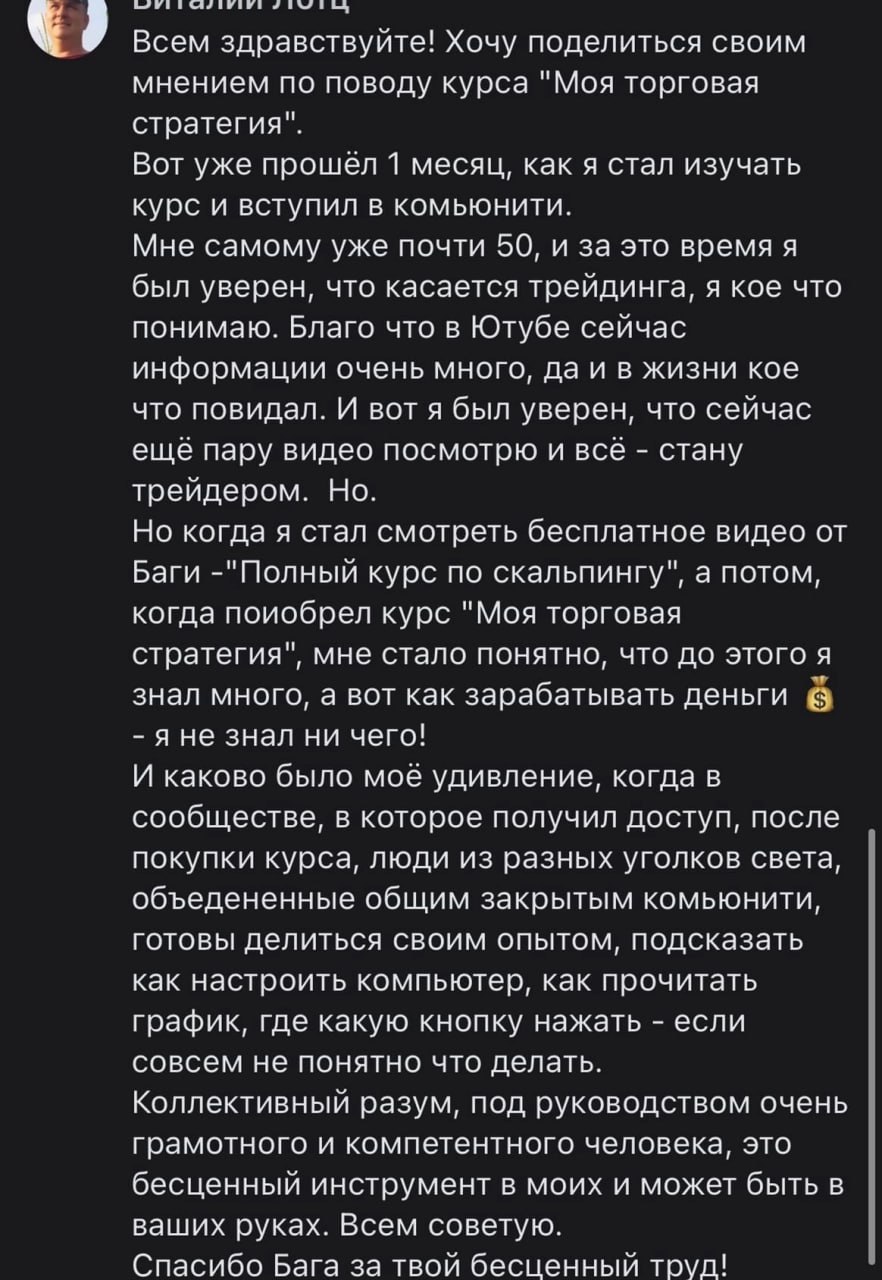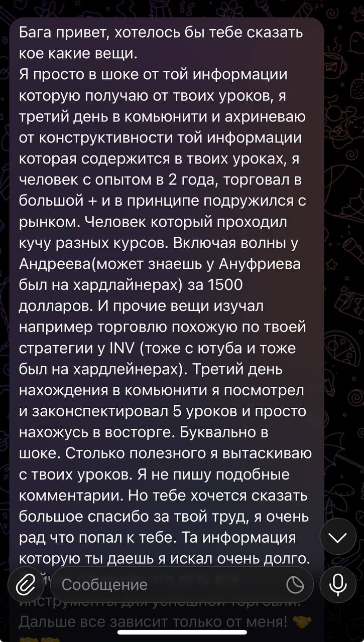 Я лично провожу совместную торговлю, мастер-классы и разборы ваших сделок — без кураторов, помощников и посредников. Если приглашаю коллег — только профессиональных трейдеров из цеха. Обучение можно начать в любой момент, доступ к материалам бессрочный.