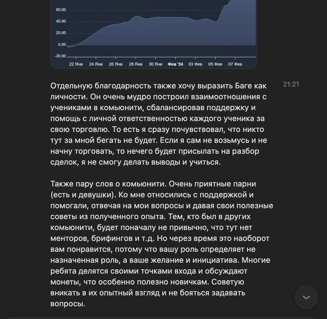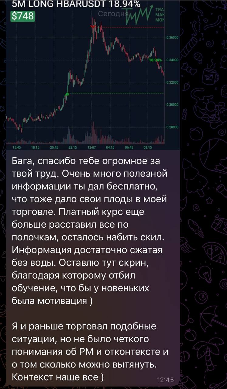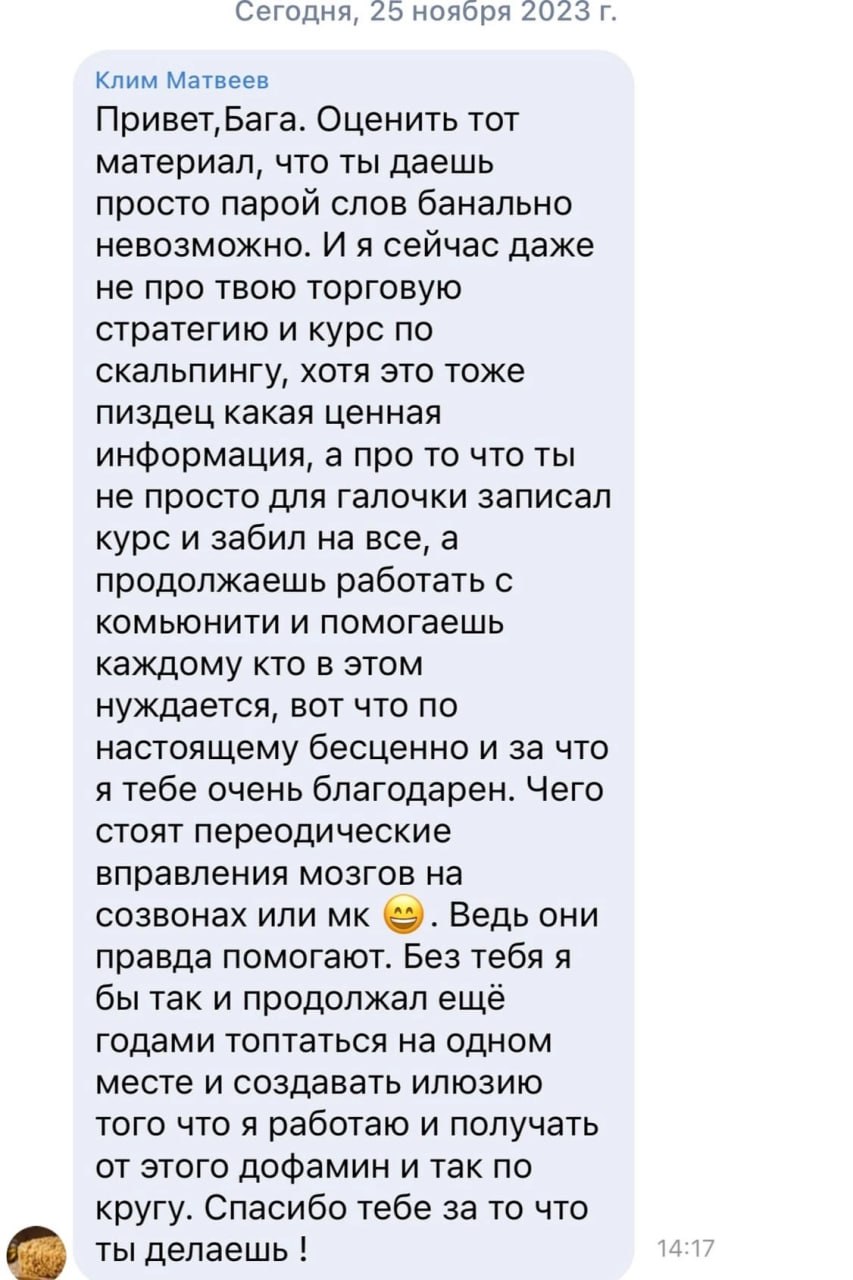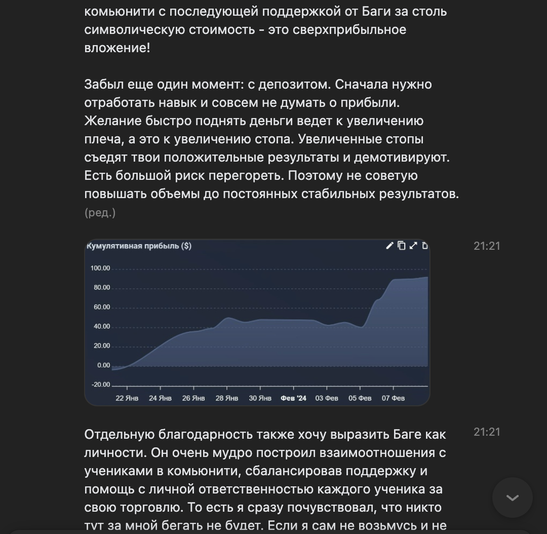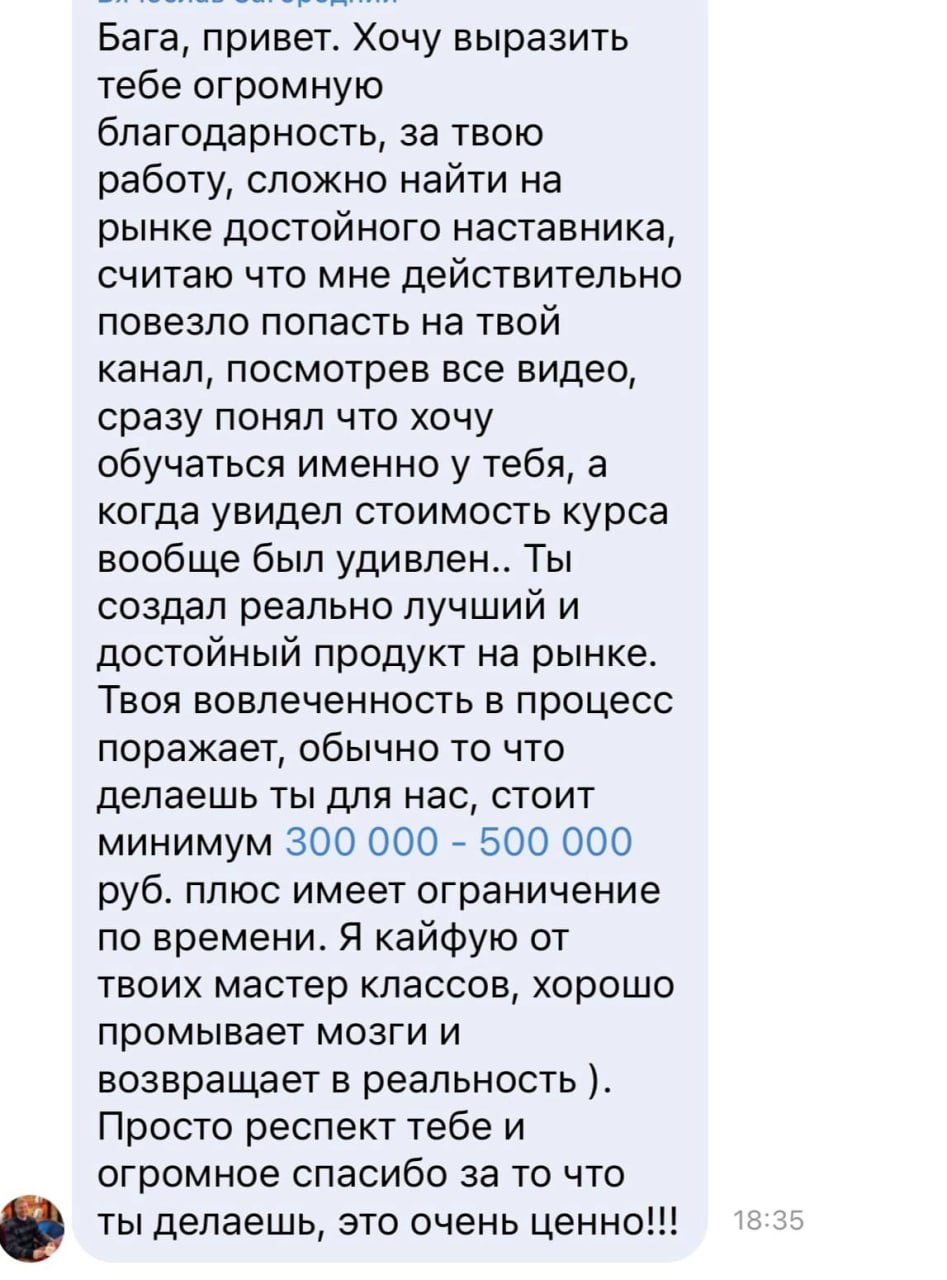 Я лично провожу совместную торговлю, мастер-классы и разборы ваших сделок — без кураторов, помощников и посредников. Если приглашаю коллег — только профессиональных трейдеров из цеха. Обучение можно начать в любой момент, доступ к материалам бессрочный.