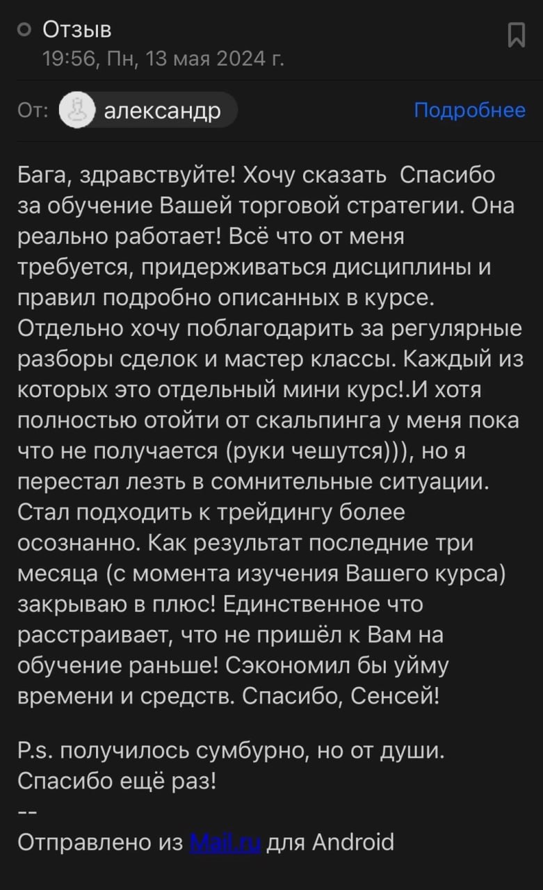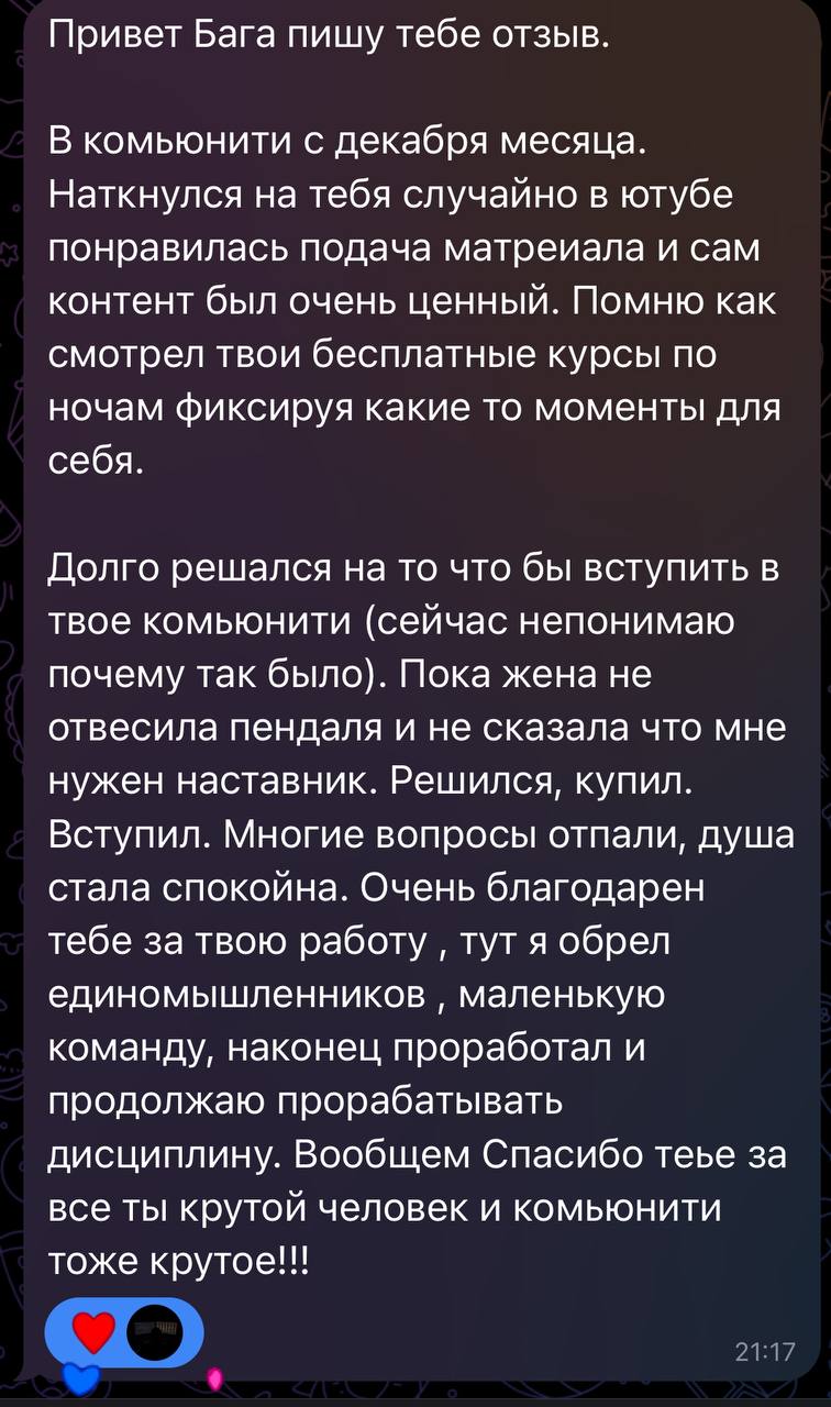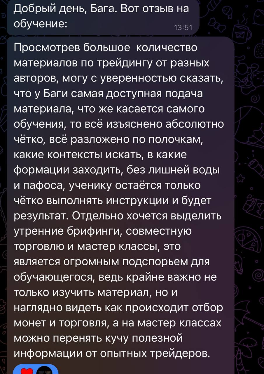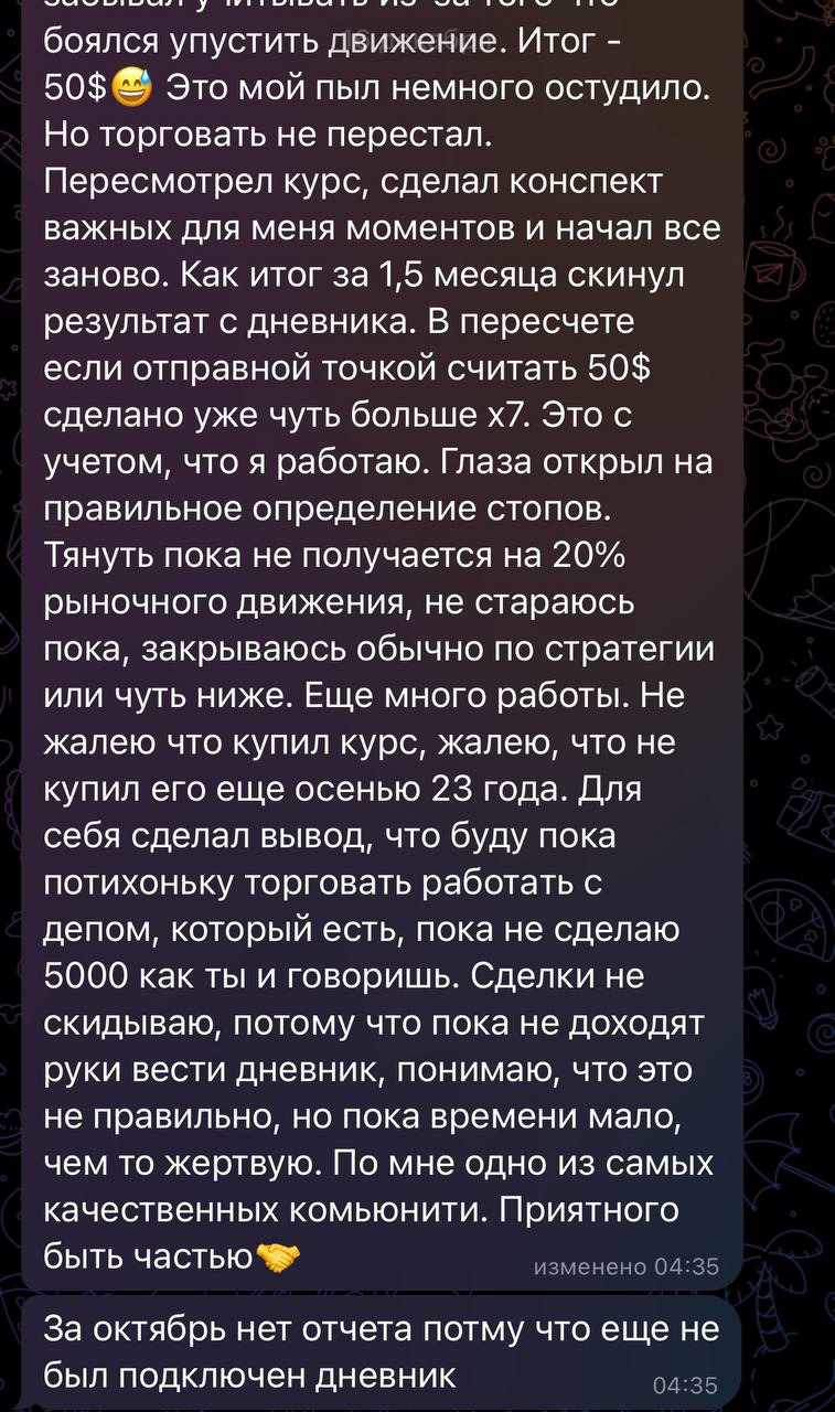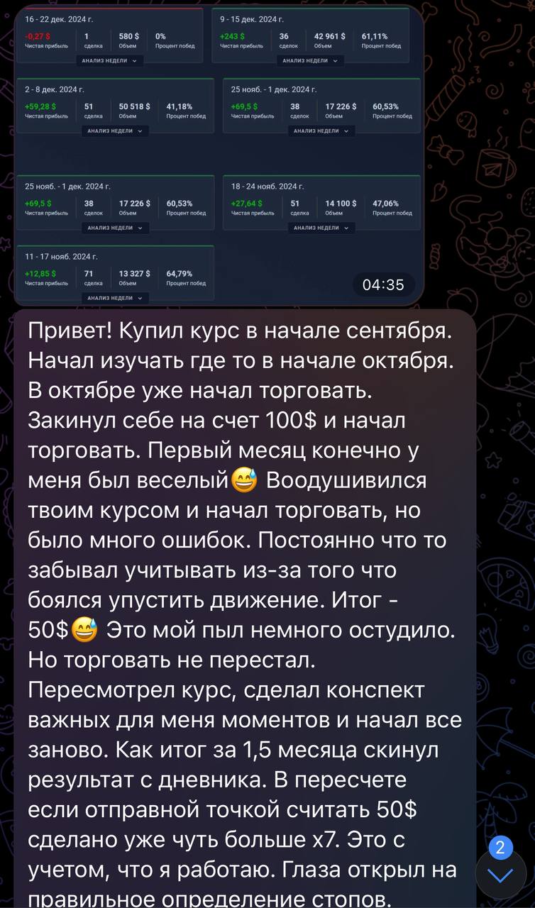 Я лично провожу совместную торговлю, мастер-классы и разборы ваших сделок — без кураторов, помощников и посредников. Если приглашаю коллег — только профессиональных трейдеров из цеха. Обучение можно начать в любой момент, доступ к материалам бессрочный.