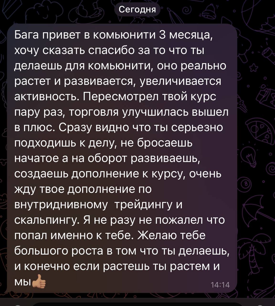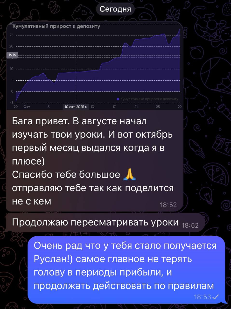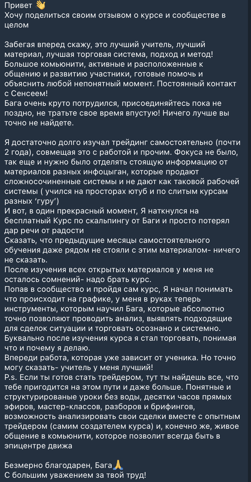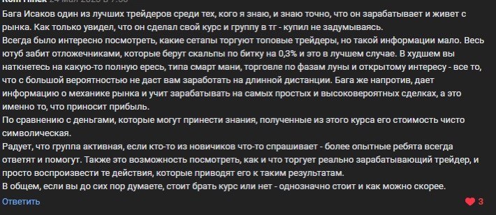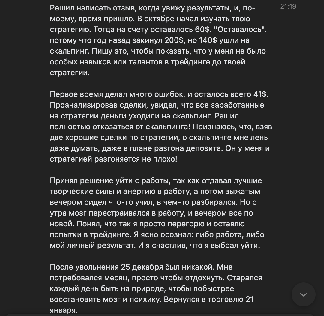 Я лично провожу совместную торговлю, мастер-классы и разборы ваших сделок — без кураторов, помощников и посредников. Если приглашаю коллег — только профессиональных трейдеров из цеха. Обучение можно начать в любой момент, доступ к материалам бессрочный.